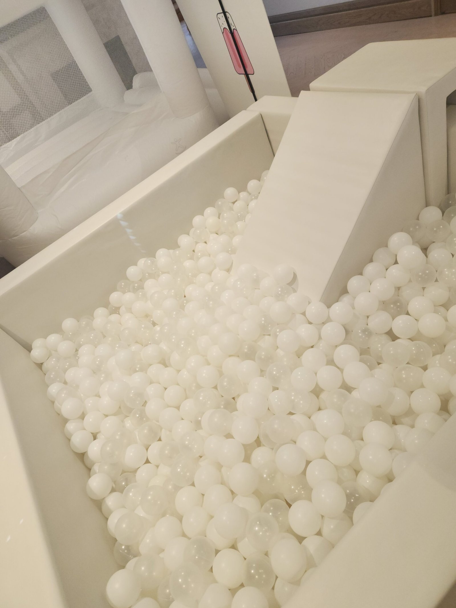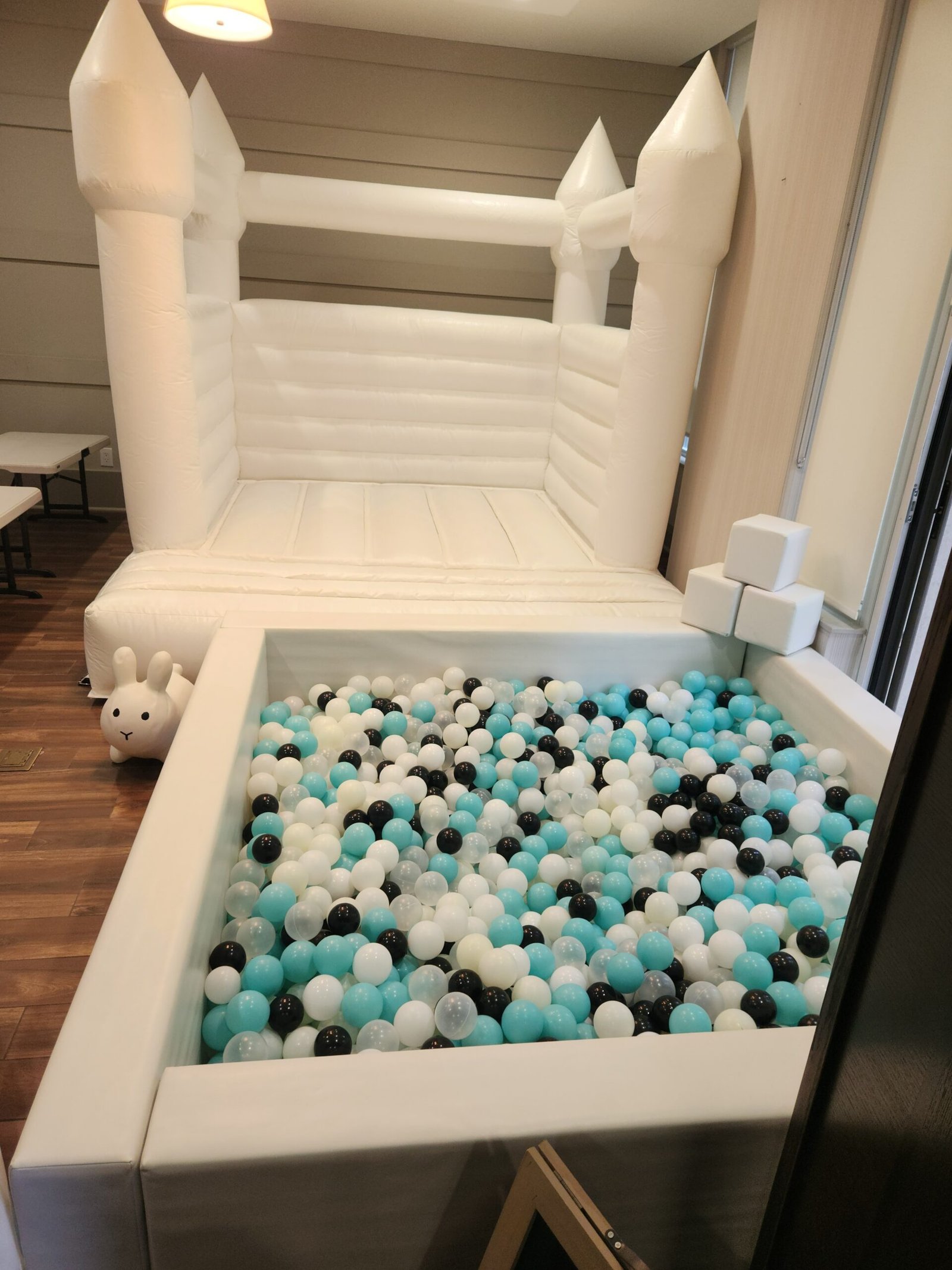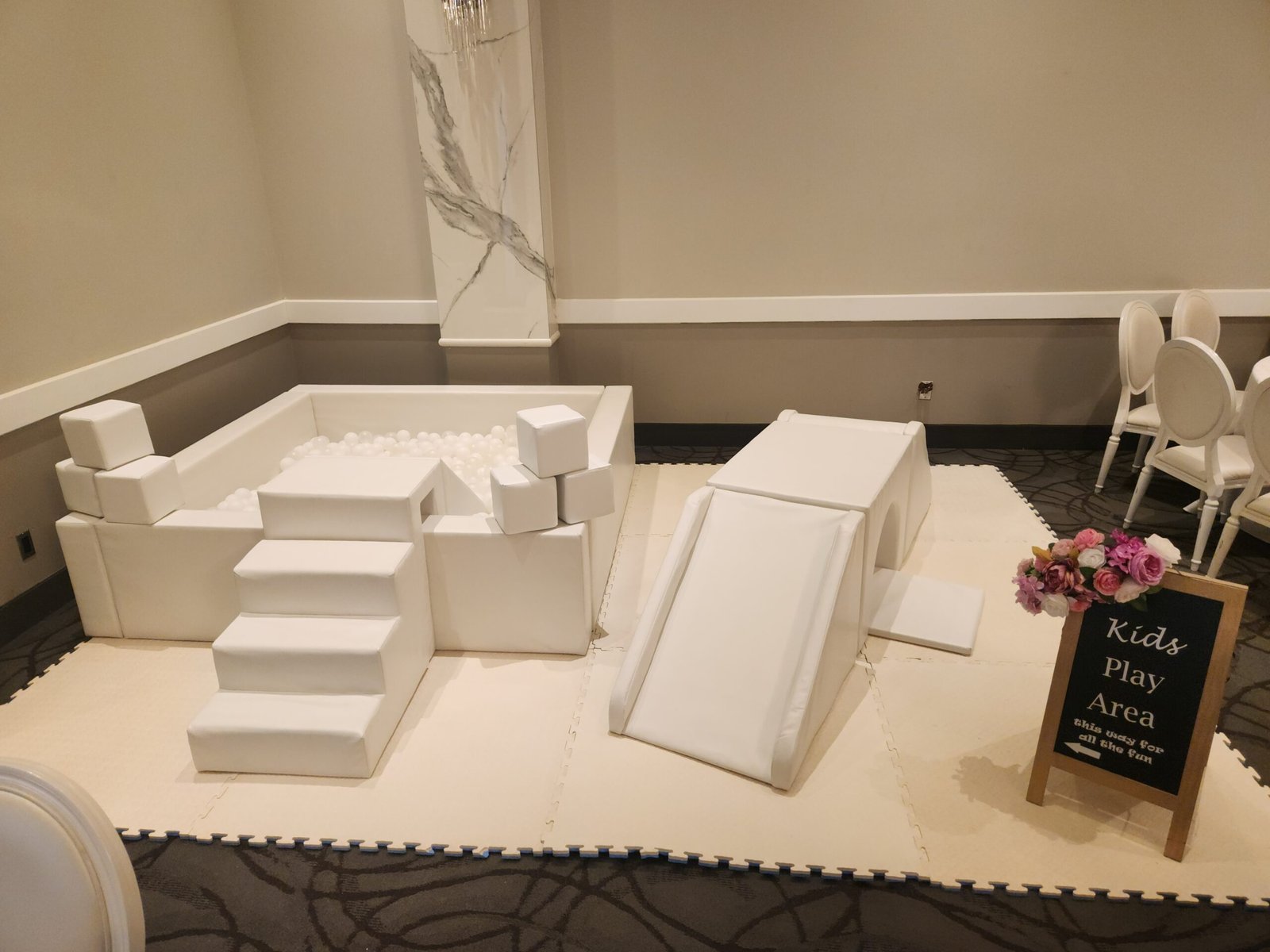 2 x 6ft x 6ft White ball pit with stairsFoam slide in the pit Soft foam matsWhite + Clear balls + up to 2 accent colors12 Foam Building Blocks3 piece climb and slideArch ClimberPlastic Slide2 x Animal Hoppers2 x Soft foam car rockersCustom name sticker