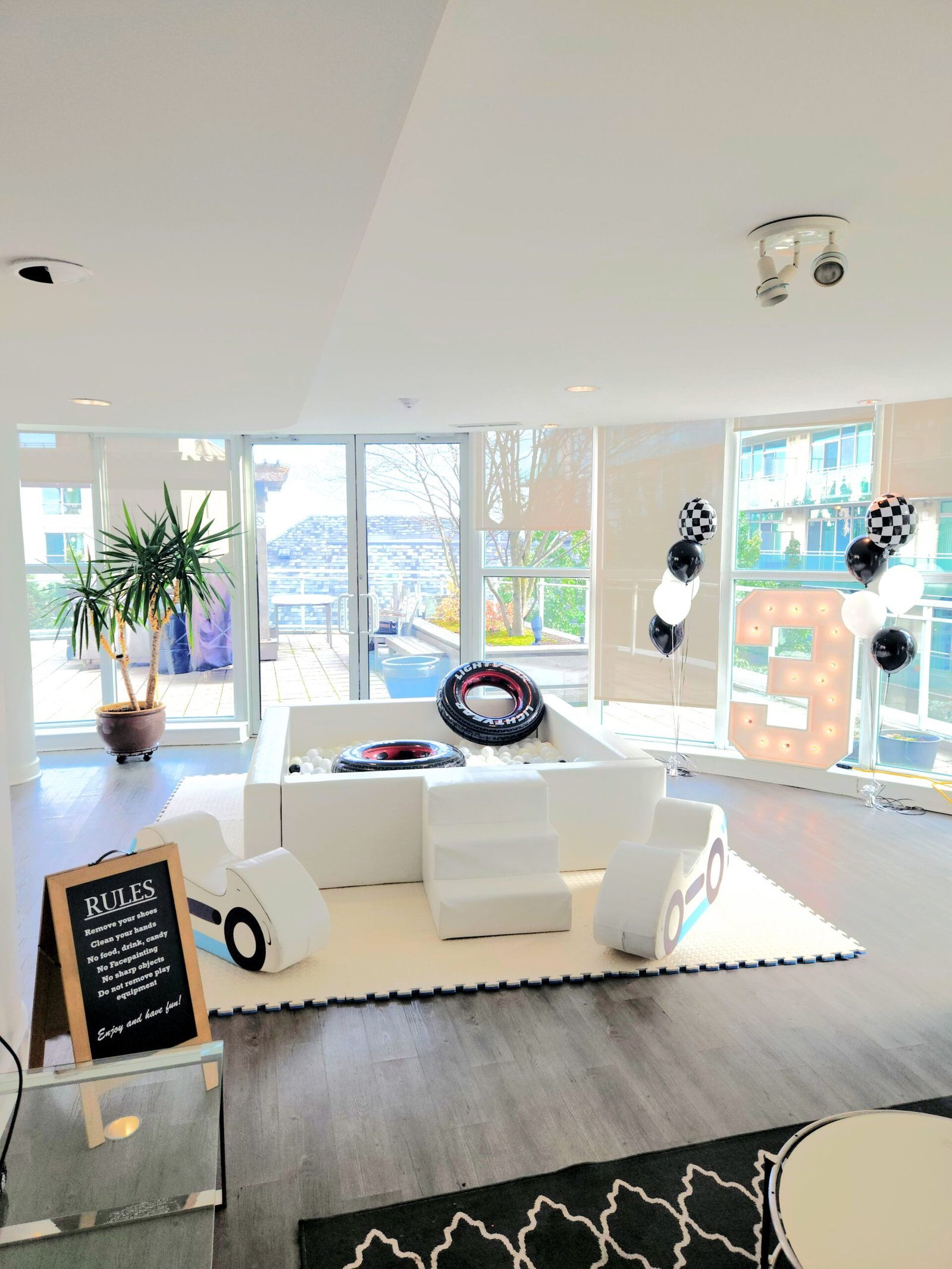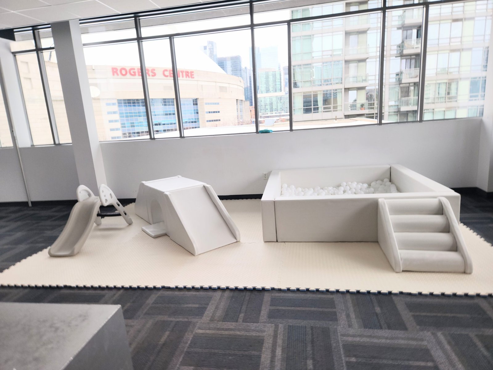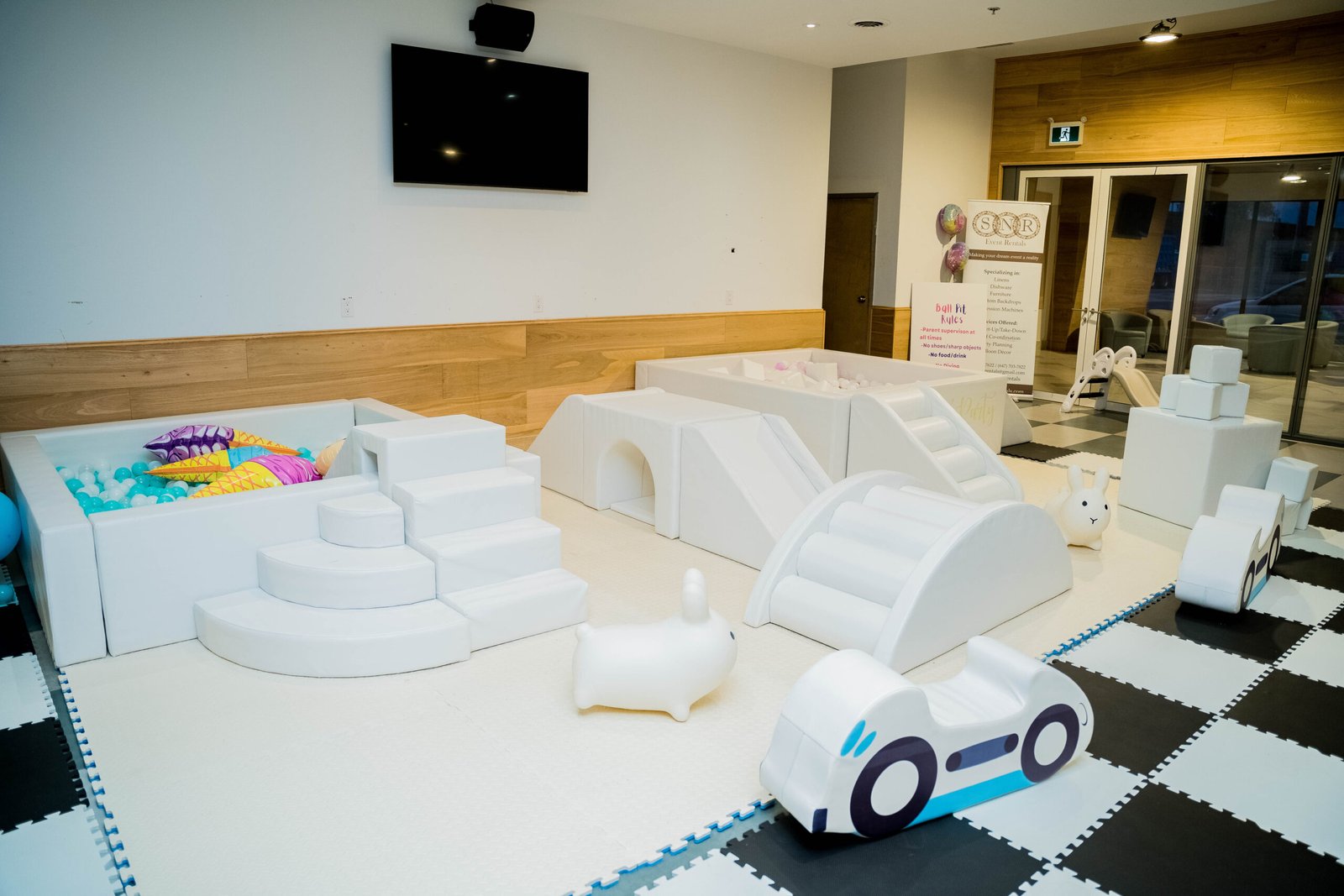 2 x 6ft x 6ft White ball pit with stairsFoam slide in the pit Soft foam matsWhite + Clear balls + up to 2 accent colors12 Foam Building Blocks3 piece climb and slideArch ClimberPlastic Slide2 x Animal Hoppers2 x Soft foam car rockersCustom name sticker