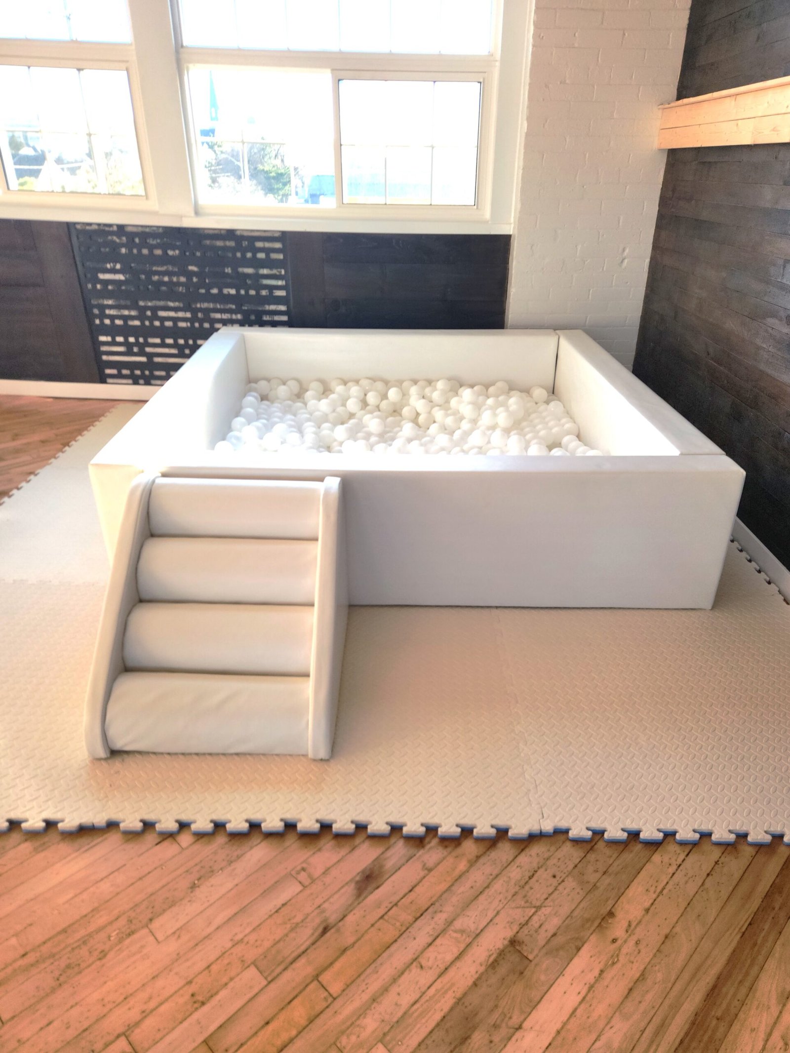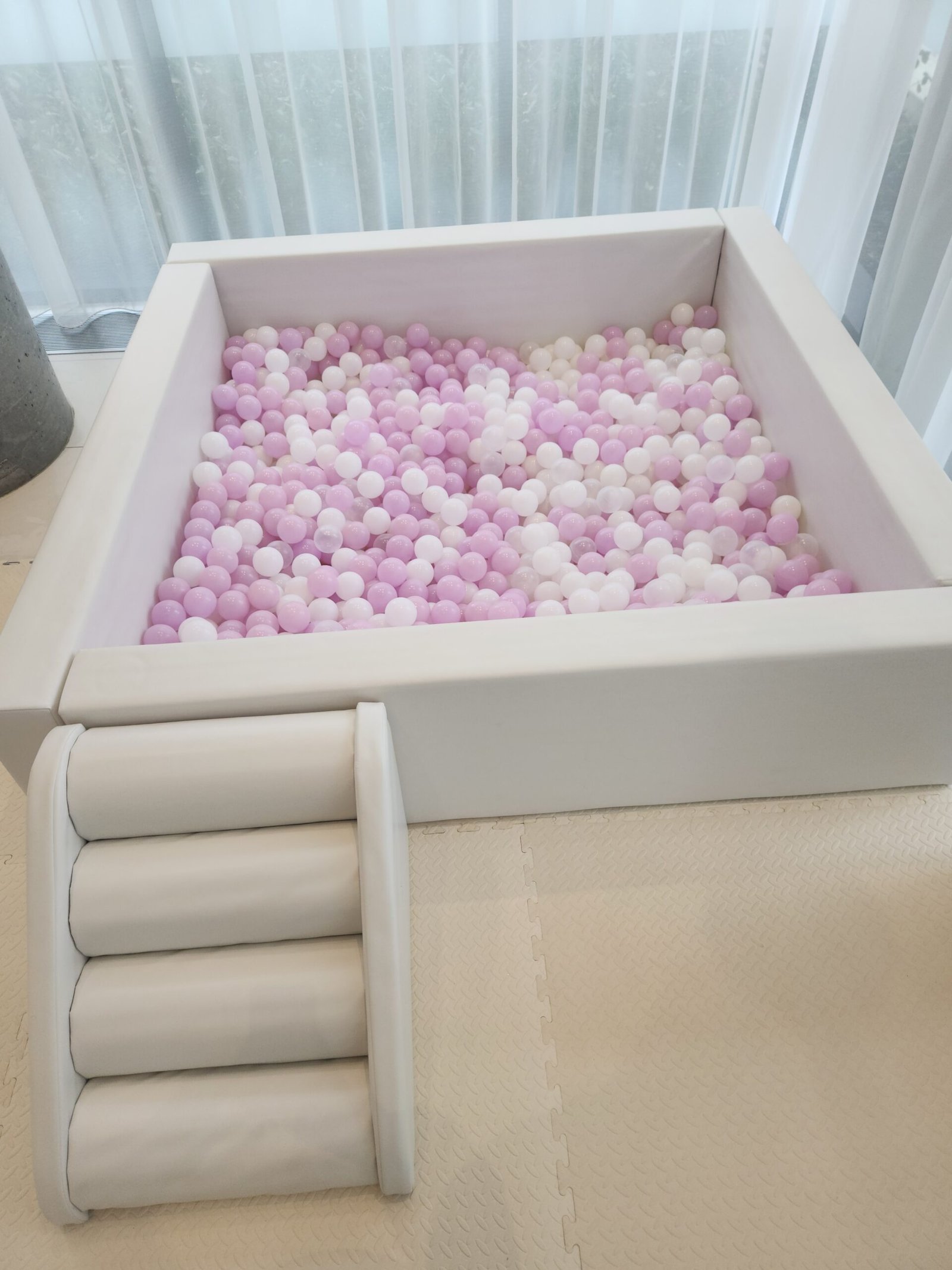 6ft x 6ft White ball pit with stairsWhite + Clear ballsSoft foam mats