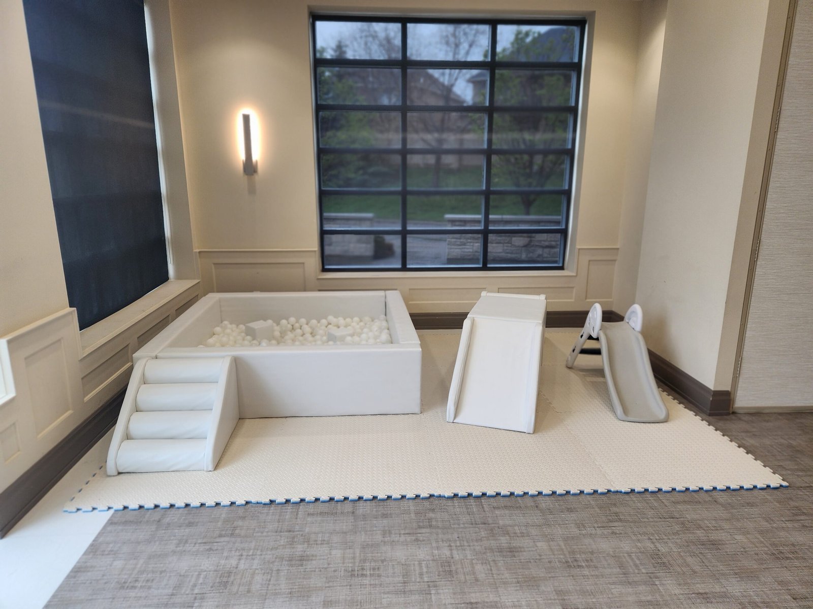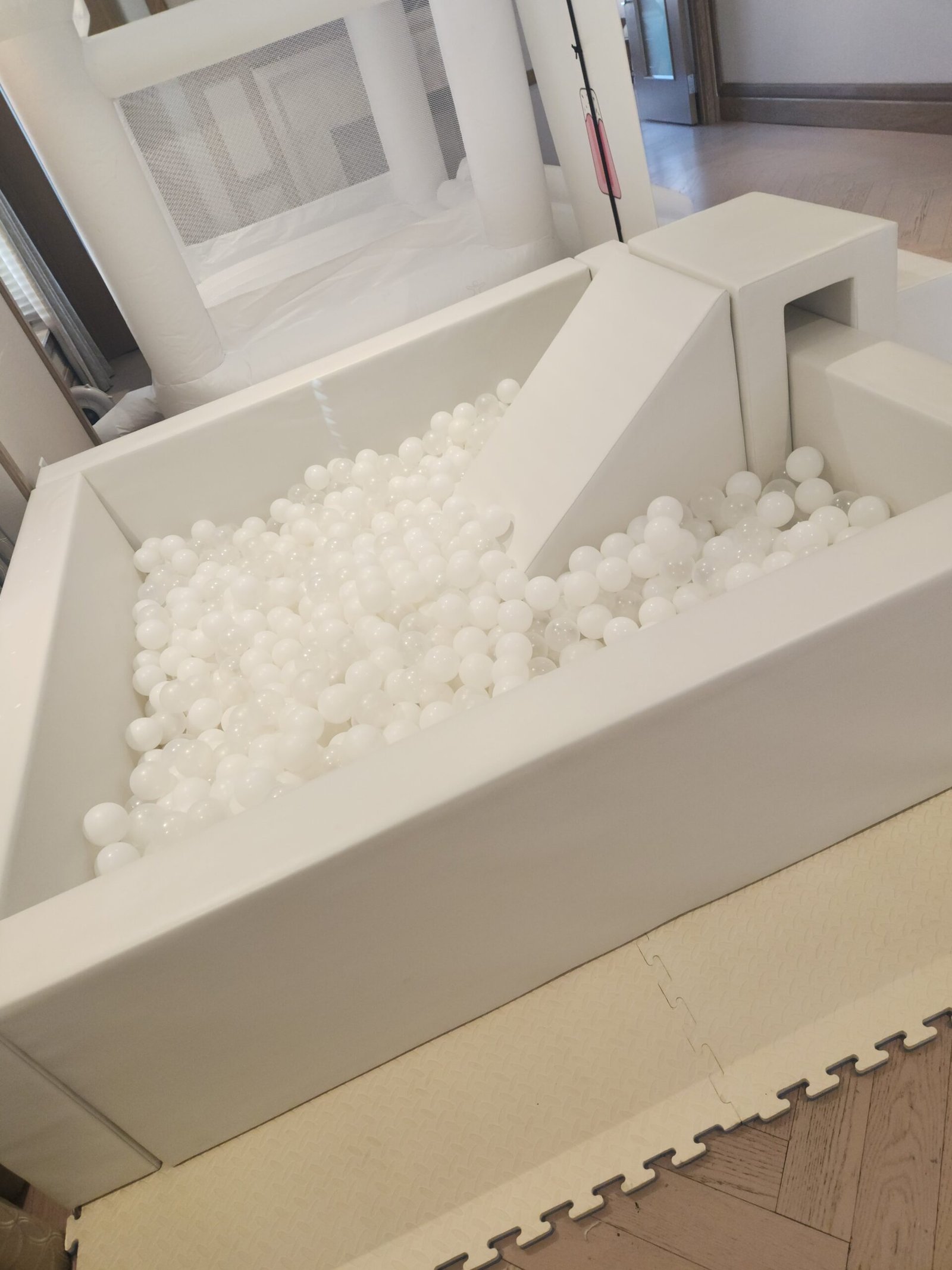 6ft x 6ft White ball pit with stairsSoft foam matsWhite + Clear balls6 Foam Building Blocks3 piece climb and slidePlastic Slide