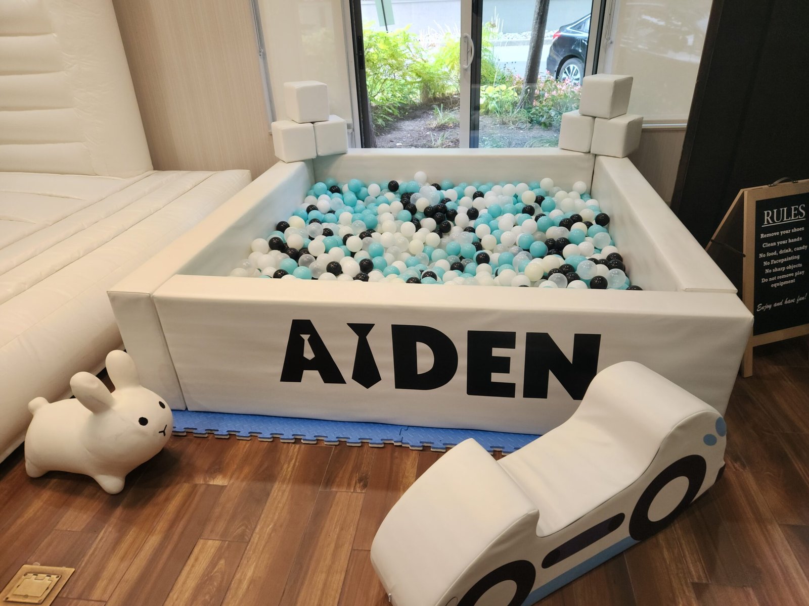 6ft x 6ft White ball pit with stairs + foam slide in the pitSoft foam matsWhite + Clear balls + 1 accent color10 Foam Building Blocks2 x Soft foam car rockersArch climber2 x Animal HoppersPlastic SlideCustom name sticker